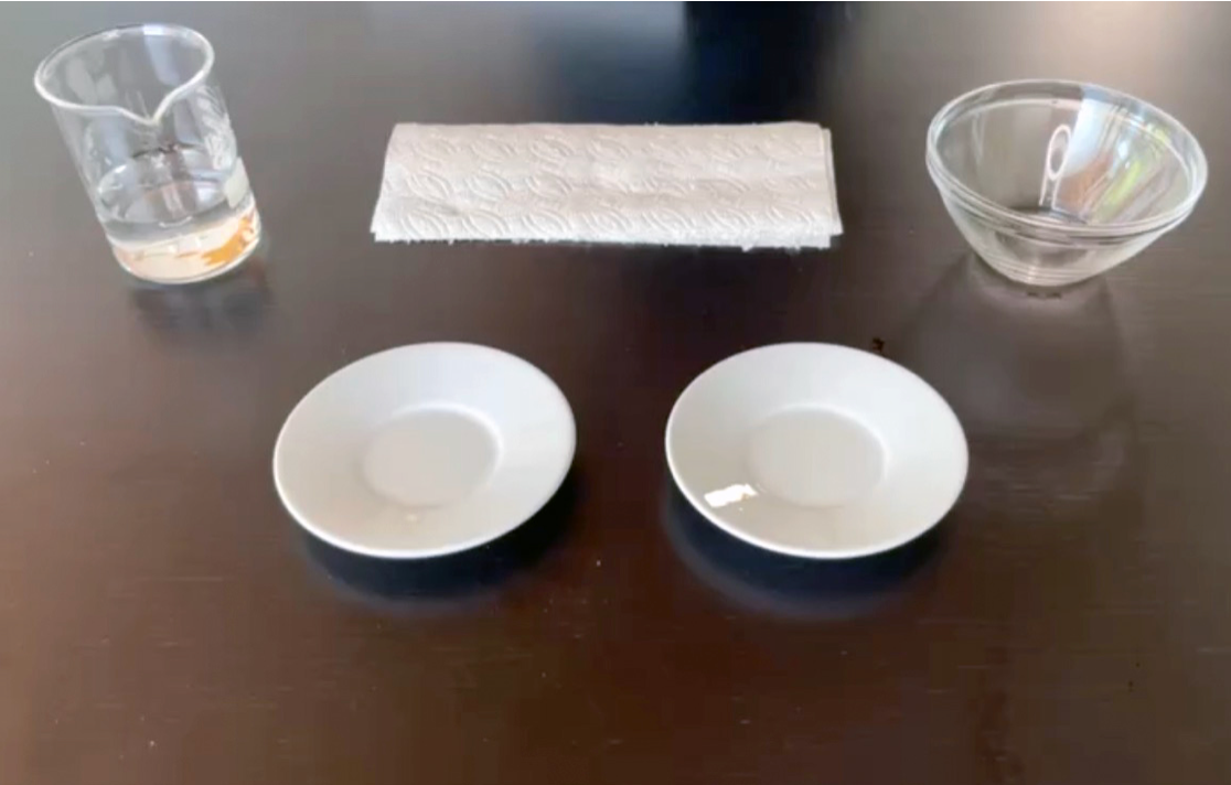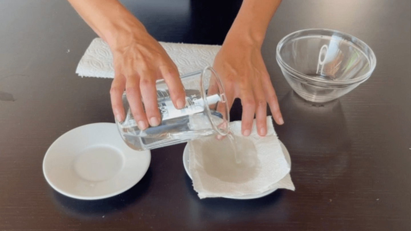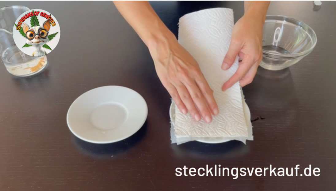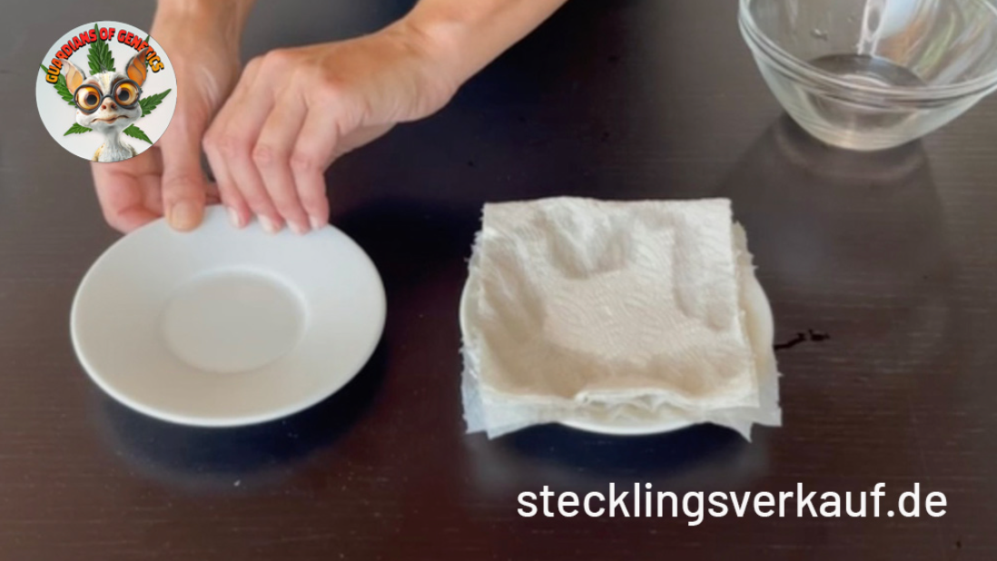 Nehmt den ersten Teller und legt mehrere Lagen Haushaltspapier darauf. Gießt anschließend Wasser darüber, bis das Papier gut befeuchtet ist, aber vermeidet stehendes Wasser. Das Papier sollte feucht, aber nicht durchnässt sein.